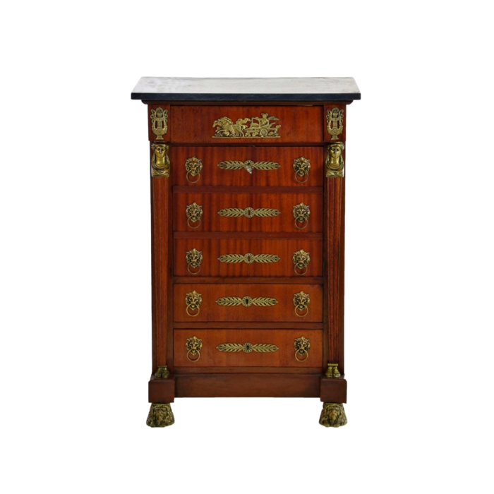 Decorado com ferragens em latão, figuras femininas, cabeças de leão e cavalos.