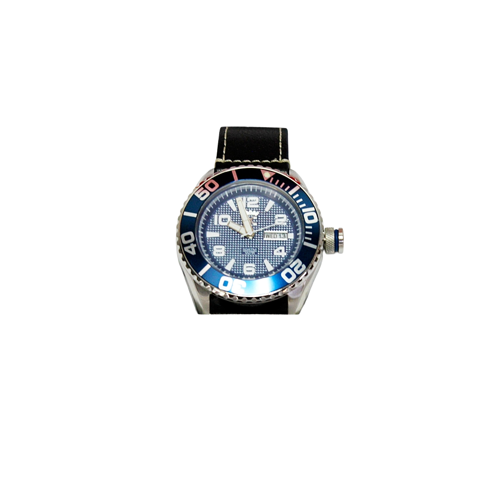 Relógio com caixa de aço, escala rotativa em azul marinho e mostrador da mesma cor.